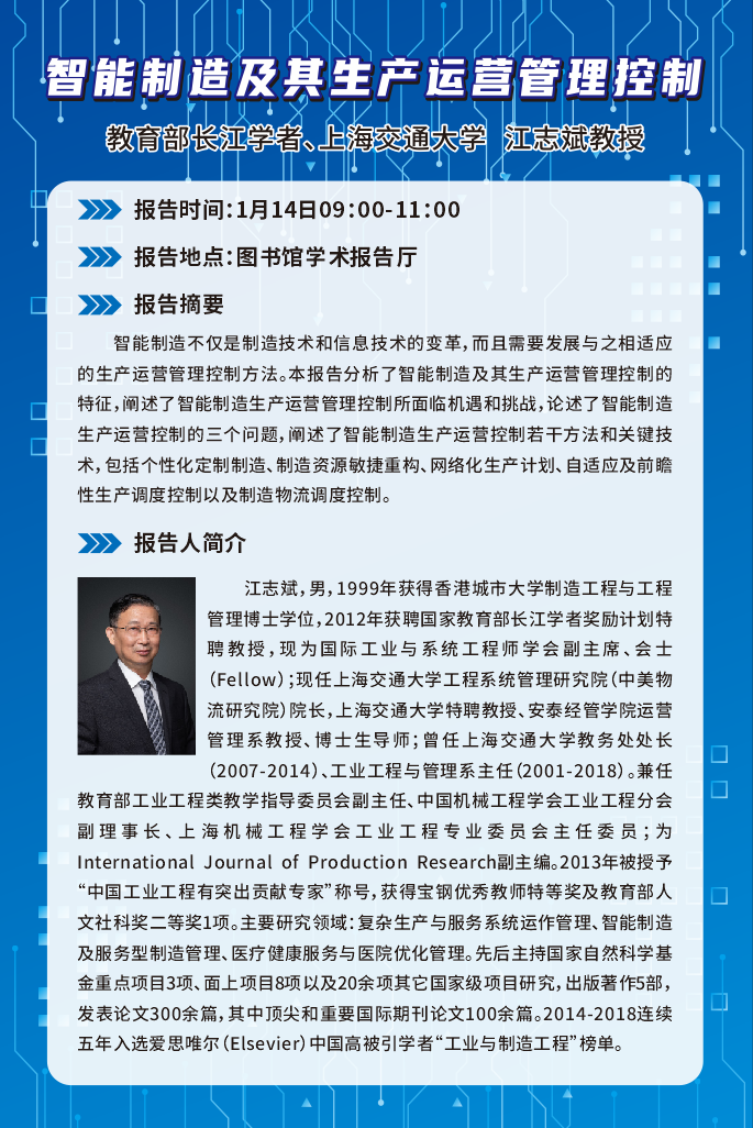 江志斌,男,1999年获得香港城市大学制造工程与工程管理博士学位,现为国际工业与系统工程师学会副主席、会士(Fellow);现任上海交通大学工程系统管理研究院(中美物流研究院)院长,上海交通大学特聘教授、安泰经管学院运营管理系教授、博士生导师;曾任上海交通大学教务处处长(2007-2014)、工业工程与管理系主任(2001-2018)。兼任教育部工业工程类教学指导委员会副主任、中国机械工程学会工业工程分会副理事长、上海机械工程学会工业工程专业委员会主任委员;为International Journal of Production Research副主编。2013年被授予“中国工业工程有突出贡献专家”称号,获得宝钢优秀教师特等奖及教育部人文社科奖二等奖1项。主要研究领域:复杂生产与服务系统运作管理、智能制造及服务型制造管理、医疗健康服务与医院优化管理。先后主持国家自然科学基金重点项目3项、面上项目8项以及20余项其它国家级项目研究,出版著作5部,发表论文300余篇,其中顶尖和重要国际期刊论文100余篇。2014-2018连续五年入选爱思唯尔(Elsevier)中国高被引学者“工业与制造工程”榜单。